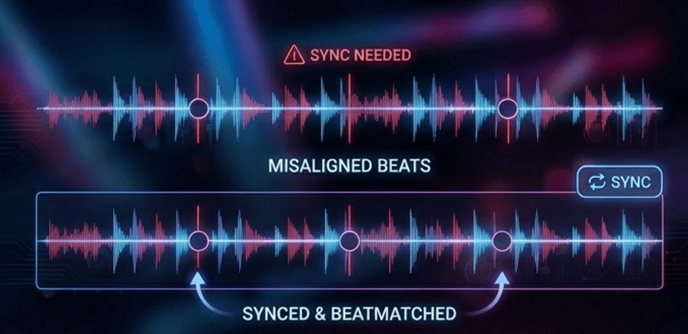 You need to align the tempo. While you can use a pitch shift fader to manually match beats, you can also use the sync button. The goal is to ensure the kick drums land simultaneously. PulseDJ helps here by suggesting tracks within a +-10 BPM range, ensuring the tempo change isn't too drastic.