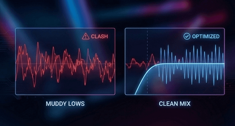 When you play two tracks at once, you effectively double the bass volume and kick drums, which can muddy the sound. To get a natural sound, you must carve out space in the frequency spectrum. I often use a high pass filter to cut the lows of the incoming track. This ensures the important elements - like the vocal or the melody - cut through without clashing with the playing track's bass.